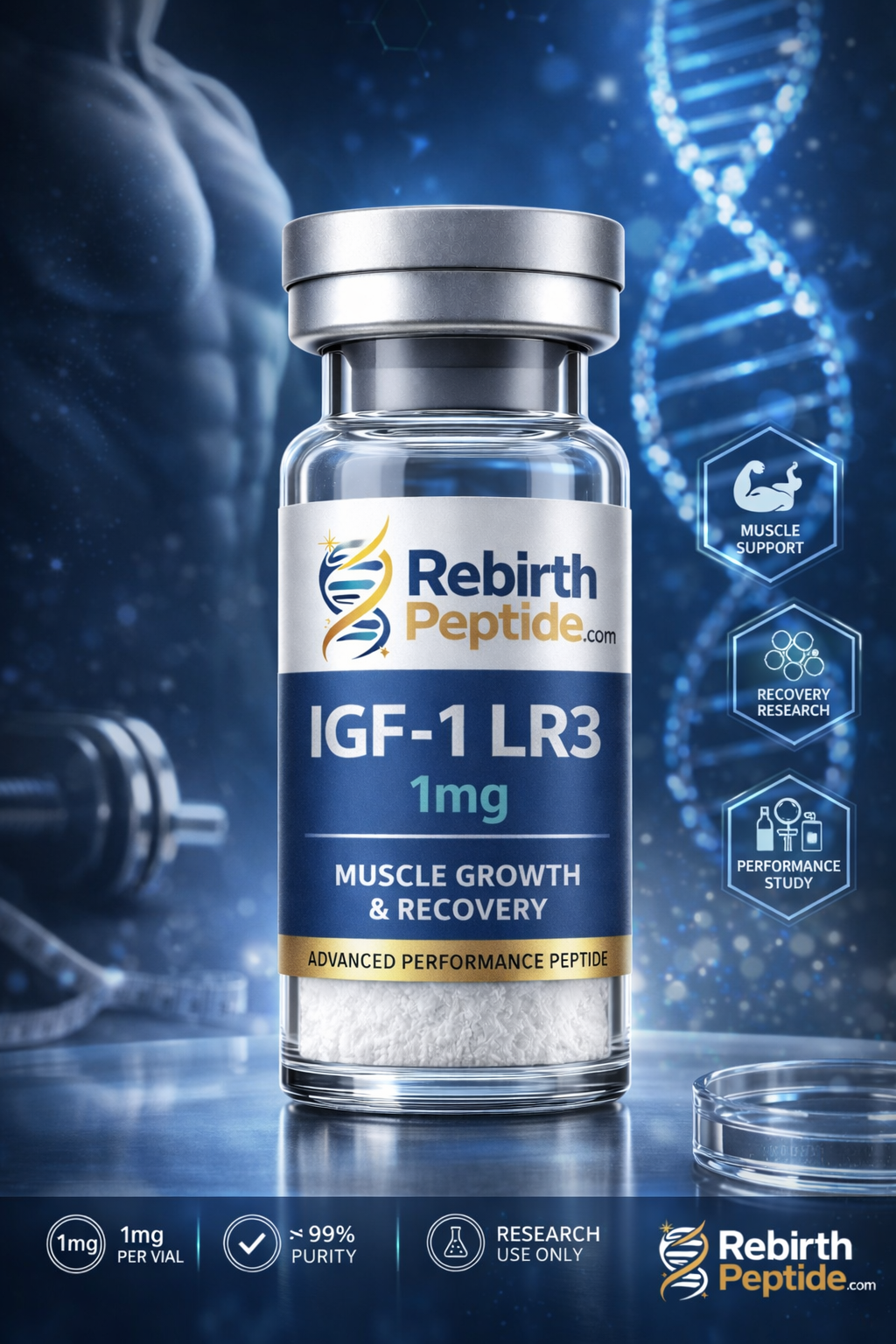 At RebirthPeptide, our IGF-1 LR3 1mg is produced with strict quality standards, ensuring high purity and reliability for research applications.
